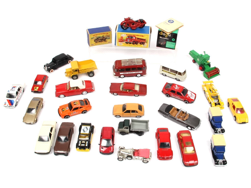 un modèle avec moteur à friction (fonctionne poussivement) - on y retrouve notamment les marques : DUGU, MATCHBOX, NOREV, CRAGSTAN, SOLIDO & MINIALUXE - avec manques & parties cassées selon les modèles