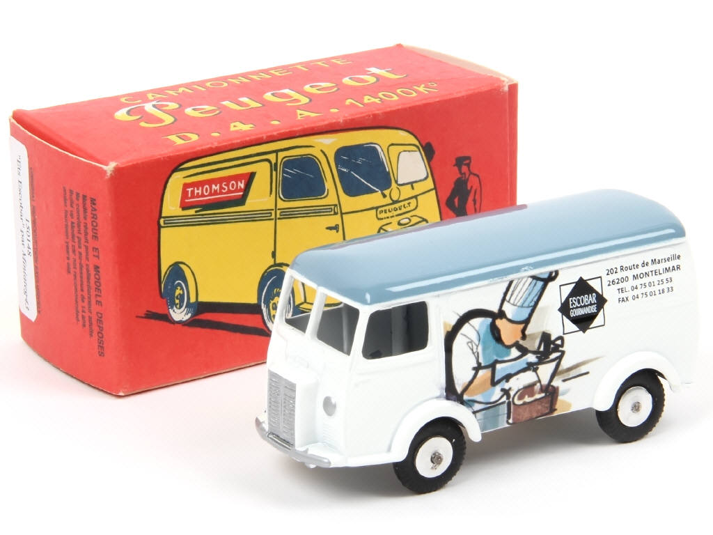 QUIRALU (FRANCE) 150148 PEUGEOT D4A fourgon 'ESCOBAR GOURMANDISE' blanc, avec toit gris bleu