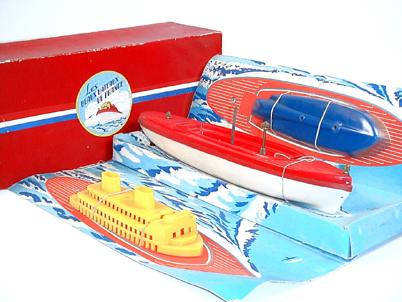 longueur 36 cm - moteur à clef (fonctionne) - avec 2 éléments supérieurs permettant de transformer le bateau soit en paquebot soit en vedette - provient d'un fond de magasin - 36 cm long - wind-up mechanism (in working condition) - with 2 add-on accessories allowing you to transform the boat into either a liner or a launch - original shop stock