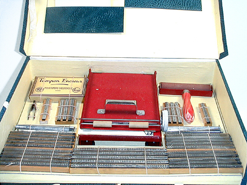 comprend un ensemble de tampons & de typons d'imprimerie, tampon dateur, encreur, pince à caractères, machine à imprimer, notice, etc... - l'ensemble jamais déballé - provient d'un fond de magasin - includes a set of printing letters, letter tweezers, date stamps, inkpad, printing machine, leaflet etc...set never opened - original shop stock