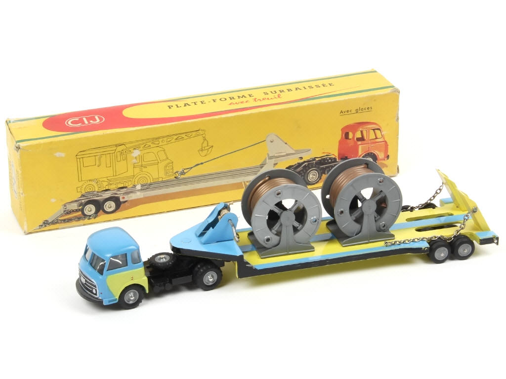 C.I.J. (FRANCE) 4/75 SAVIEM LRS Semi-remorque surbaissée porte-bobines de câble bleu & jaune vert