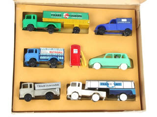 moteurs à friction (fonctionnent) - miniatures reproduisant les modèles : CITROËN, BERLIET & RENAULT - quelques rayures sur les lithographies plus ou moins importantes - on y joint une pompe à essence - ensemble présenté dans un coffret (non d'origine)