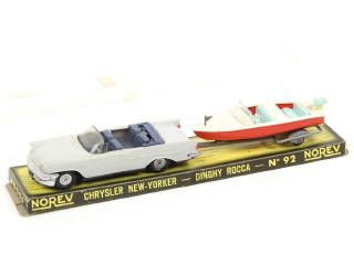 NOREV (FRANCE) 92 CHRYSLER NEW YORKER avec hors-bord ROCCA sur remorque gris intérieur bleu foncé