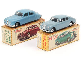 comprend : LANCIA AURELIA & JAGUAR 2.4L (une petite trace d'étiquette sur la boîte) - jantes légèrement fondues - très légères déformations des carrosseries