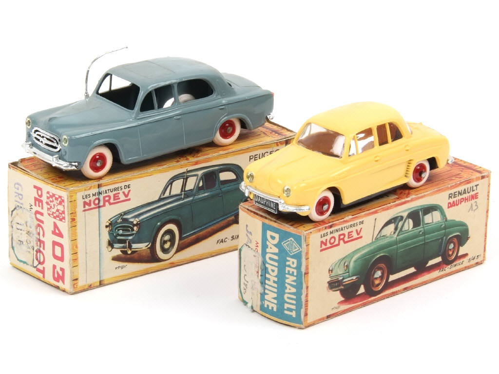 comprend : RENAULT DAUPHINE (une trace d'étiquette sur la boîte, vitre de lunette arrière fêlée) & PEUGEOT 403 (boîte en état 'c') - jantes très légèrement fondues - très légères déformations des carrosseries - traces d'étiquettes sur les boîtes