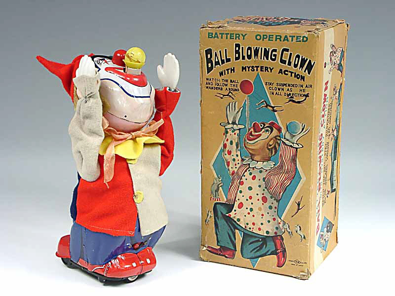 référence 56C du livre de BRIAN MORAN 'BATTERY TOYS' - hauteur 27 cm - en action, le clown avance en zigzagant tout en bougeant les bras & en soufflant pour que la balle s'envole (la balle reste à environ 10 cm du visage du clown) - les mécanismes fonctionnent - 27 cm high - in action, the clown zigzags forward whilst moving his arms and blowing to make the ball fly (the ball stays at around 10 cm above the clown's face) - in working condition - SCARCE