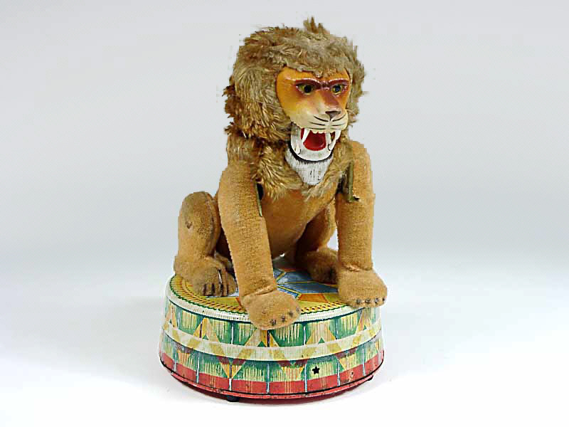 référence 5C du livre de BRIAN MORAN 'BATTERY TOYS' - hauteur 27 cm - en action, le lion se dresse, rugit, agite ses pattes avant & sa tête lorsque l'on appuie sur l'un des contacteurs du socle - il se rasseoit lorsque l'on touche l'autre contacteur - les mécanismes fonctionnent - planché oxydé - 27 cm high - in action, the lion stands up, roars, waves his front paws & his head when you press one of the buttoms on the base, sits back down when you press the other - in working condition - underside rusted