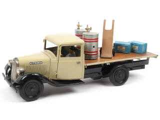 longueur 46 cm - avec moteur à clef (fonctionne), direction par le volant & phares électriques (non testés) - restaurations avec petits manques & quelques éléments non d'origine (chargement, diable & conducteur également non d'origine)