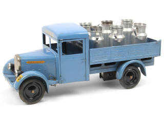 longueur : 43 cm - avec moteur à clef (fonctionne), phares électriques (non testés) & direction - inscriptions au pochoir 'CAMIONNAGE' (en lettres noires) sur le fronton de cabine, 4748-RNG sur l'arrière du plateau & 'TD' sur l'aile avant gauche - quelques restaurations, éléments non d'origine & retouches plus ou moins importantes - avec 6 pots à lait collés sur le plateau - petites traces d'oxydation par endroits