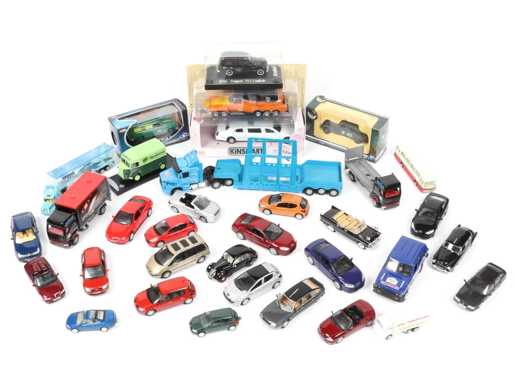 différentes échelles - on y retrouve notamment les marques : MAJORETTE, SOLIDO, ATLAS, WELLY & NOREV - comprend notamment les modèles : PEUGEOT, CITROËN & RENAULT - 5 modèles en boîtes en états 'b' à 'c' - possibilité de manques & parties cassées