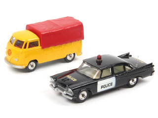 comprend : VOLKSWAGEN COMBI pick-up bâché & DODGE ROYAL SEDAN 'POLICE' (petites craquelures sur le gyrophare, micro-projections de peinture sur la carrosserie par endroits) - on y retrouve les marques : CORGI TOYS & DINKY TOYS
