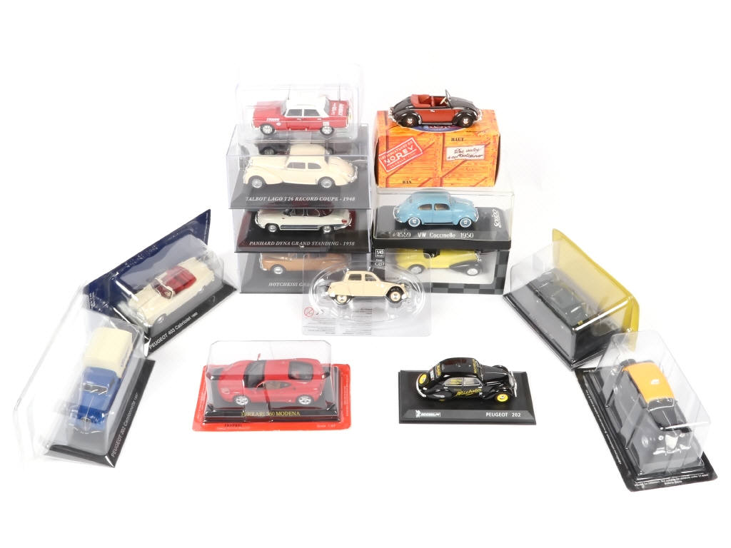 on y retrouve notamment les marques : HACHETTE, NOREV, SOLIDO & NEWRAY - comprend notamment les modèles : FORD, FERRARI, PEUGEOT & CITROËN - un modèle sans boîte - boîtes en état 'b' - manques & parties cassées