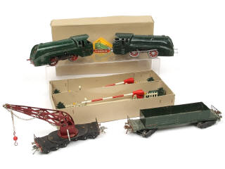comprend : 2 locomotives mécaniques (moteurs fonctionnent), wagon grue & tombereau - passage à niveau non testé (boite en état 'c' - avec annotations) - restaurations, parties non d'origine, manquantes, casées avec traces d'oxydation