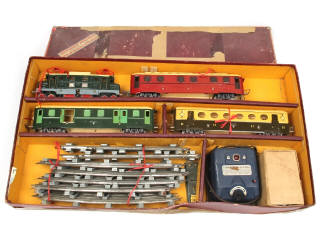 non testé - dimensions : 80 x 42 cm - états 'B' à 'C' - contient : motrice éléctrique type boite-à-sel E501, voiture de voyageurs de 2ème classe, wagon fourgon à bagages, wagon postal, transformateur & 14 rails (ternis - traces d'oxydation) - quelques petits frottements sur les carrosseries par endroits & légères déformations - on y joint un transformateur de la marque SABIR (état 'D')