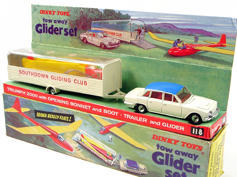 DINKY TOYS (GB) 118 TRIUMPH 2000 & Remorque avec planeur crème, toit bleu