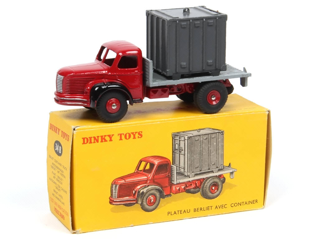DINKY TOYS (FRANCE) 34B BERLIET Plateau avec container (version avec anneau moulé) rouge, plateau gris clair