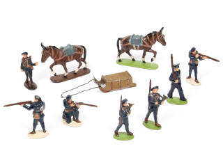 QUIRALU (FRANCE) Ensemble de 6 chasseurs alpins, un aviateur, 2 mules & un traîneau