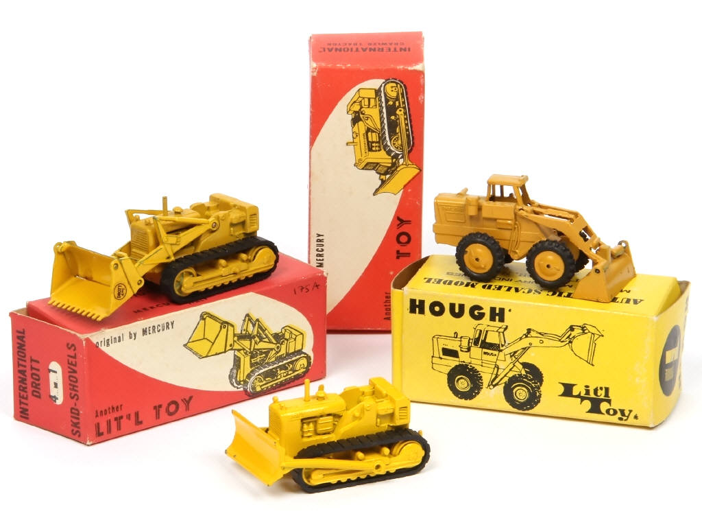 série 'LIT'L TOY' - comprend les versions : lame (quelques éclats sur cette dernière) & benne preneuse - on y joint une HOUGH chargeuse sur pneus de la marque MERCURY USA (état 'B'-'b', petites déformations par endroits) - boîtes avec étiquettes collées & petites annotations