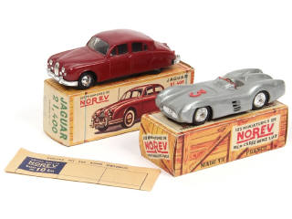 comprend les modèles : JAGUAR 2.4L & MERCEDES de compétition - carrosseries très légèrement déformées - jantes très légèrement fondues - avec bulletin d'inscription au 'GRAND RALLYE NOREV' 1957