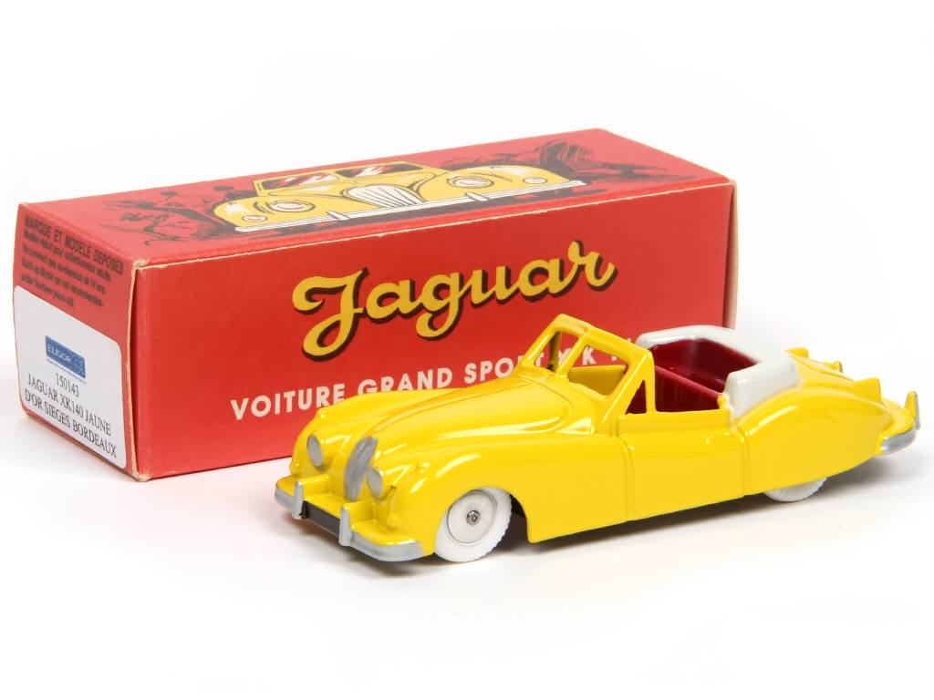 QUIRALU (FRANCE) 150143 JAGUAR XK140 roadster Jaune, capote blanche, sièges bordeaux