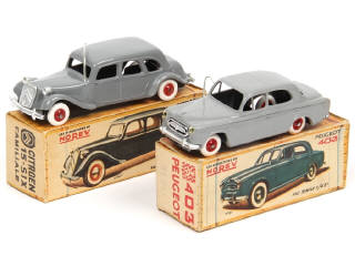 comprend : CITROËN 15 SIX & PEUGEOT 403 (boîte en état 'c' avec mention 'BLEU') - carrosseries légèrement déformées - jantes très légèrement fondues