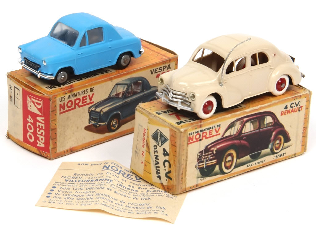 comprend : RENAULT 4CV (importantes déchirures sur la boîte, avec bon d'inscription au club) & VESPA 400 (jantes plus ou moins fondues, boîte légèrement encrassée)