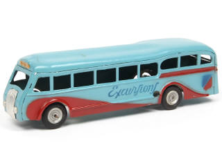 longueur : 23 cm - avec moteur à clef (fonctionne) & direction - avec inscriptions '9635-RJ', 'PULLMAN RENAULT' & 'EXCURSIONS' au pochoir - très légers frottements sur la carrosserie par endroits, notamment sur l'avant du toit - traces d'oxydation sur le bloc moteur et les axes de roues