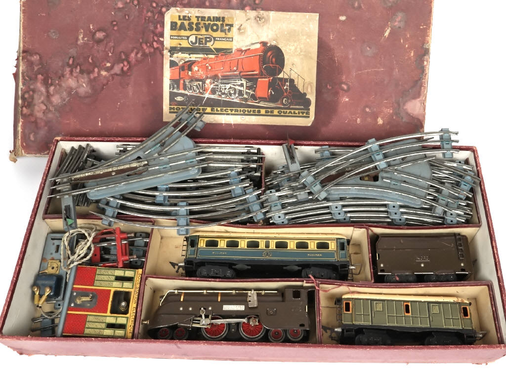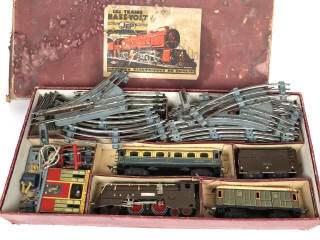 non testé - dimensions : 79 x 38 cm - états 'C' & 'D' - contient : locomotive carénée à vapeur type 222 avec tender, une voiture de voyageurs PULLMAN, un wagon à bagages, une sous-station éléctrique, différents rails (ternis), un heurtoir & un contacteur - traces d'oxydation plus ou moins importantes par endroits - quelques petits manques