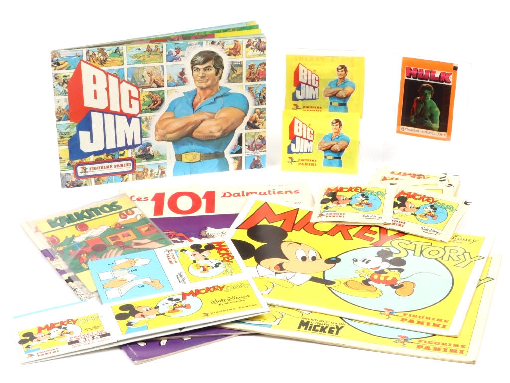 comprend : un album BIG JIM (incomplet) & 2 pochettes (une ouverte), 2 albums LES 101 DALMATIENS (incomplets), une pochette HULK, 2 albums MICKEY STORY vides, 20 pochettes non ouvertes & une boîte revendeur - possibilité de parties déchirées - on y joint une planche de décalques 'KALKITOS'