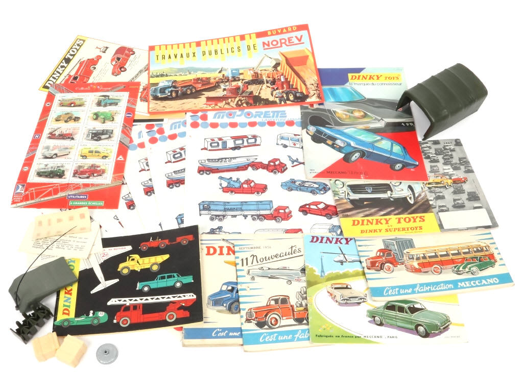 comprend : catalogues DINKY TOYS FRANCE (années 1954, 55, avril 56, septembre 56, 57, 61 & 71), un GB, planche de timbre neufs, 6 pochettes revendeur MAJORETTE, un buvard NOREV, 3 cartes postales & accessoires d'origine DINKY TOYS FRANCE - quelques petites inscriptions & salissures
