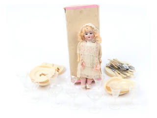 hauteur : 21 cm - avec tête en biscuit (15/0), yeux mobiles, corps & membres en composition & perruque en mohair - on y joint, un ensemble d'accessoires de table en plastique pour enfant (quelques éléments déformés & fêlés)