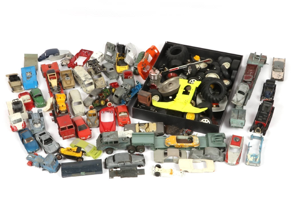 comprend notamment : carrosseries, planchers, roues & véhicules avec manques importants - on y retrouve notamment les marques : MERCURY, FJ, DINKY TOYS, RAMI, POLITOYS, POLITIL & MARKLIN - comprend notamment les modèles : CITROËN, PANHARD, ALPINE & RENAULT