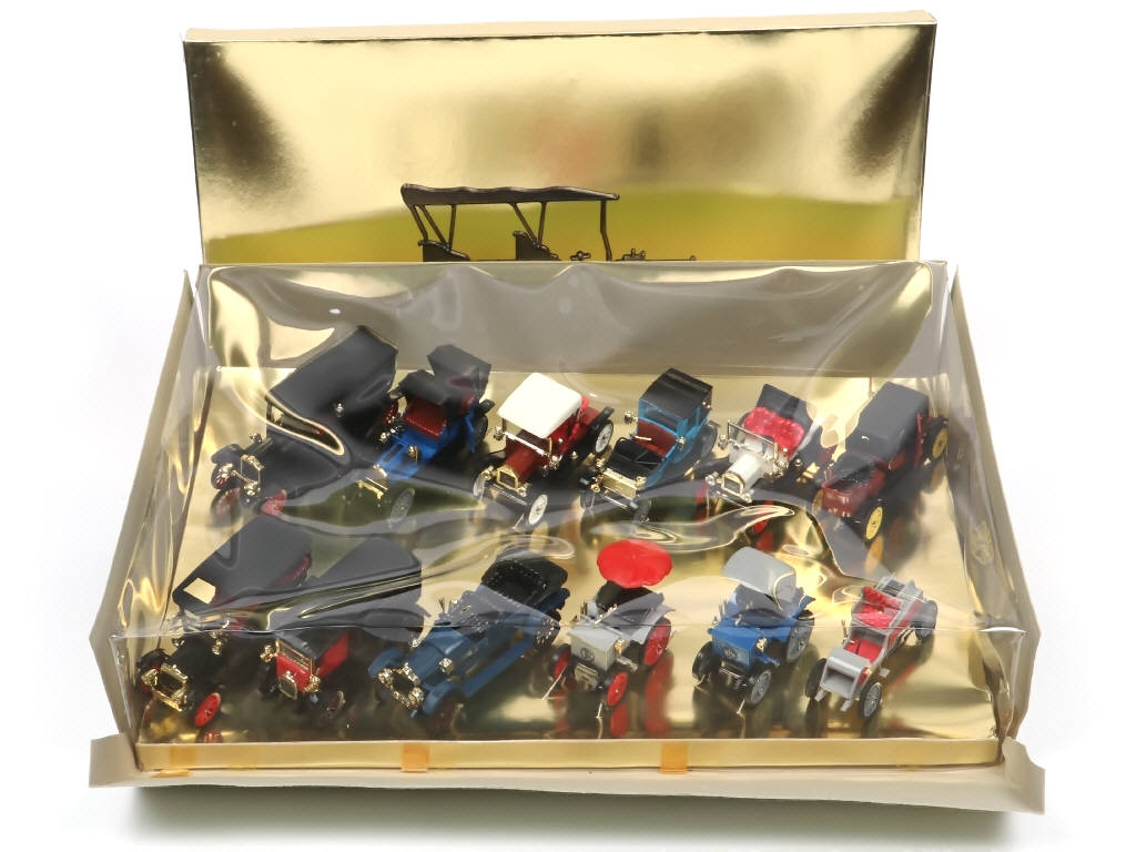 comprend notamment les modèles : PANHARD & FORD - ensemble présenté sur socle avec ficelle de maintien d'origine - certains pneus coupés - boîte déformée (suremballage légèrement décoloré)
