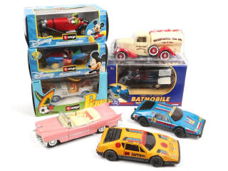 différentes grandes échelles - comprend : 3 véhicules BBURAGO dont 2 DISNEY & une PIQUE MEXICO 86, camion citerne, CADILLAC SOLIDO & BATMOBILE de la marque CORGI TOYS - 2 voitures de courses en tôle (importantes traces d'oxydation) - 3 modèles sans boite
