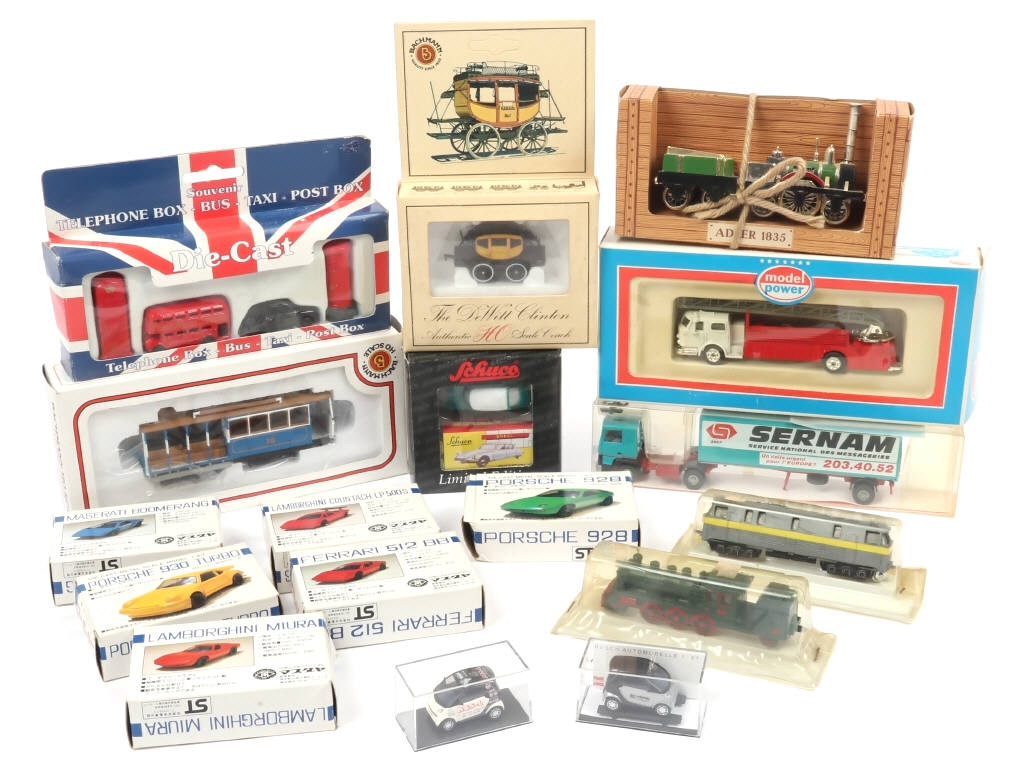 petites échelles principalement pour réseau de train - on y retrouve notamment les marques : SCHUCO (réédition de la DS), BACHMANN, MODEL POWER, RMM & ADLER - 6 modèles japonais à monter - une motrice & une locomotive à vapeur à l'échelle N non testées (un blister cassé) - les boites sont en états 'a' à 'b' (certaines avec accrocs & déformations)