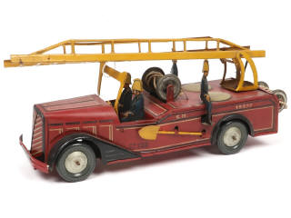 produit en 1951- longueur 35 cm - avec moteur à clef (à revoir), bruiteur (à revoir), 4 pompiers & dérouleurs - parties nickelées ternies - carrosserie plus ou moins encrassée, déformée avec traces d'oxydation par endroits
