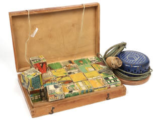 dimensions du coffret : 28 x 19 cm - contient 24 cubes avec papiers illustrés sur chaque face permettant la réalisation de différentes scènes (frottements avec manques de papier plus ou moins importants, sans affichette) - charnières de coffret endommagées (illustration en grande partie manquante) - on y joint un transformateur de la marque en état 'D' (non testé, avec manques)