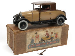 longueur 31 cm - avec moteur à clef (fonctionne), clef (traces d'oxydation), phares électriques (non testés) & conductrice d'origine - petites traces d'humidité plus ou moins importantes sur la carrosserie par endroits - manques de peinture plus ou moins importants sur les roues - barre avant de châssis désolidarisée - boîte restaurée (plus ou moins endommagée par endroits, décolorée & jaunie)