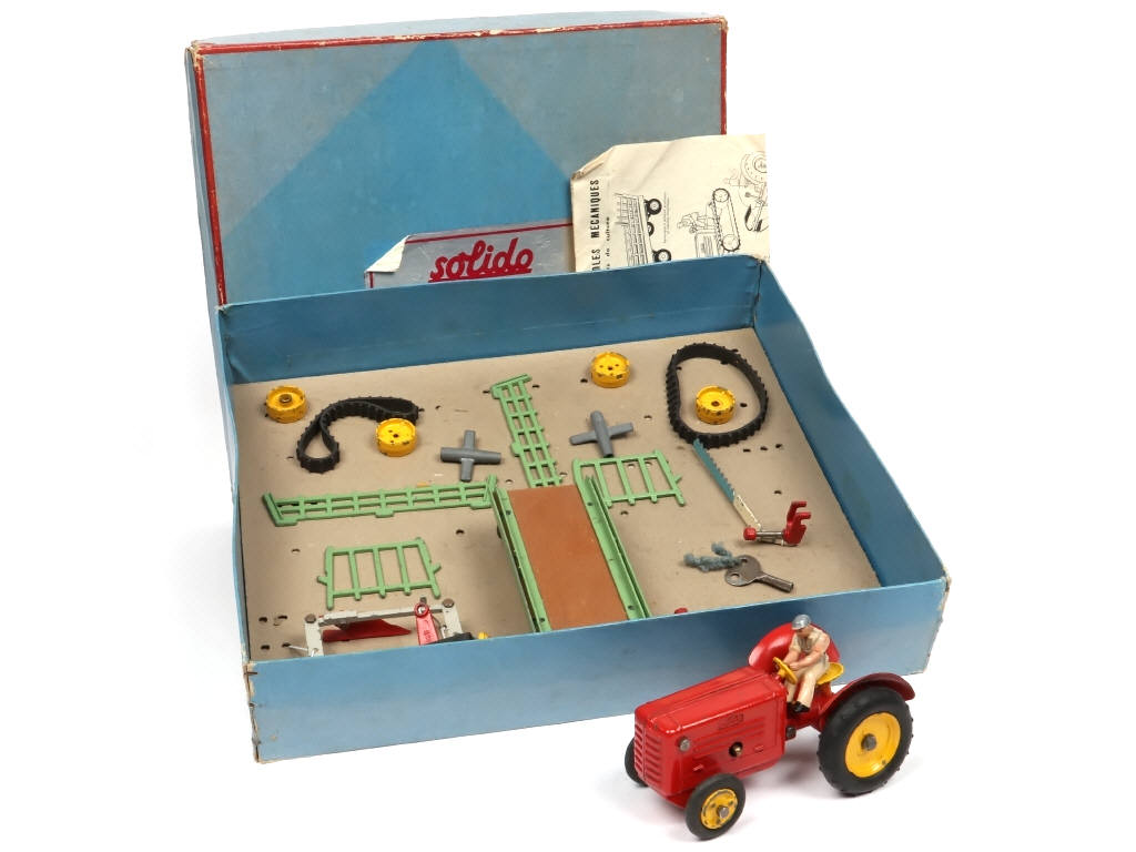 coffret plus ou moins décoloré, déchiré & taché - états 'C' & 'D' - contient : un tracteur BEAUCE (moteur à clef fonctionne), 3 clefs (dont une non d'origine), conducteur (parties fondues), charrue bisocs, trisocs sur armature, faucheuse relevable, rouleau à damer, 4 barbotins, 2 chenilles (pour la transformation du tracteur BEAUCE en tracteur FLANDRES), remorque fourragère à 4 ridelles amovibles & notice (légèrement déchirée & jaunie) - manque 2 accessoires & cordelettes de maintien