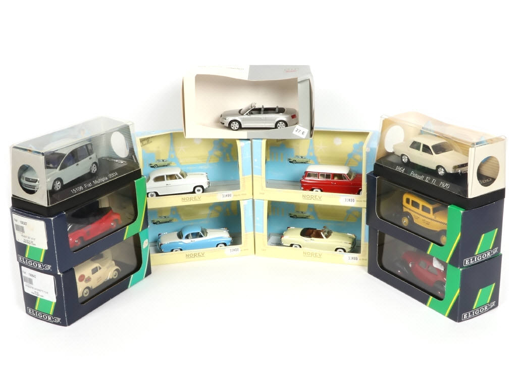on y retrouve les marques : NOREV, SOLIDO & ELIGOR - comprend les modèles : AUDI, BORGUARD, FIAT, PEUGEOT, RENAULT, FORD & PANHARD - 6 modèles en boîtes en état 'b' (étiquettes prix) & 5 modèles dans leur suremballage en état 'b' - possibilité de manques & parties cassées