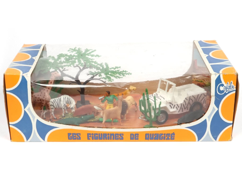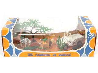 dimensions du coffret : 36x17 cm - réalisation en plastique - contient : un JEEP, personnage, 8 animaux & 3 éléments de décor - ensemble fixé sur socle de présentation illustré