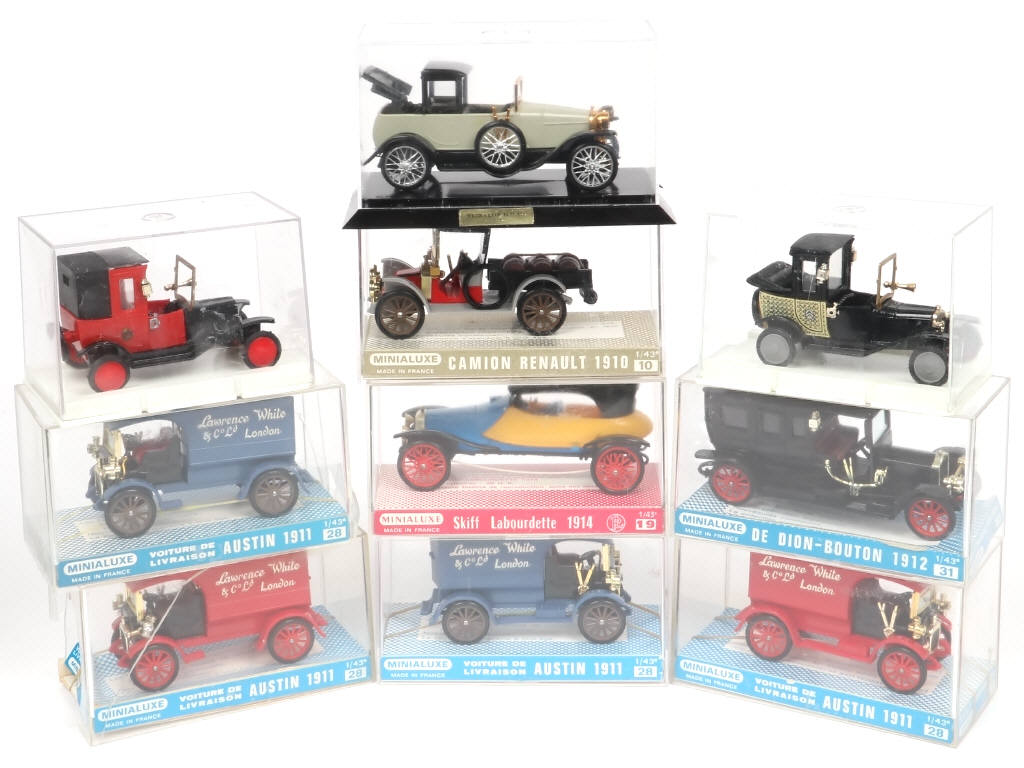 miniatures reproduisant notamment les modèles : AUSTIN, RENAULT & DE DION BOUTON - on y retrouve les marques : MINIALUXE, SAFIR & EKO - quelques petits manques & parties cassées sur certains exemplaires - les boîtes sont en états de 'b' à 'e'