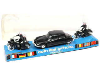 échelle 1/32ème - contient : CITROEN DS 21 (carrosserie très légèrement déformée, petite altération d'une extrémité de pare-chocs) & 3 motards (très légers manques de peinture blanche par endroits) de la police sur leur moto (une béquille cassée) - socle de boîte déformée avec blister plus ou moins jauni par endroits