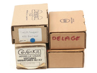 kits à monter (semblent complets) - comprend les modèles : DELAGE 1927, TALBOT 1926/27, PEUGEOT 402 DARL'MAT & SIMCA CG SPIDER - on y retrouve les marques : TOP 43, ESDO & IDEM - quelques étiquettes en partie décollées