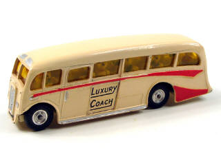 il s'agit d'une copie du moule DINKY GB référence 281 - le modèle est doté d'un plancher en métal moulé, de jantes en métal tourné, d'un aménagement intérieur avec des petits personnages & de vitres teintées jaune - un autocollant 'LUXURY COACH' est apposé sur le côté gauche