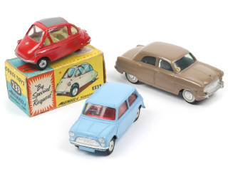 comprend : HEINKEL (détails de peinture ajoutés, en boîte état 'c'), MORRIS MINI-MINOR & FORD CONSUL (autocollants de la marque ajoutés)
