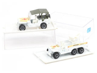 comprend : JEEP 'CROIX ROUGE' & DODGE 6x6 porte-canons de l'armée soviétique 'MOCKBA' - quelques micro-éclats & humidité par endroits - fêlures sur les couvercles de boite dont un avec une fixation manquante
