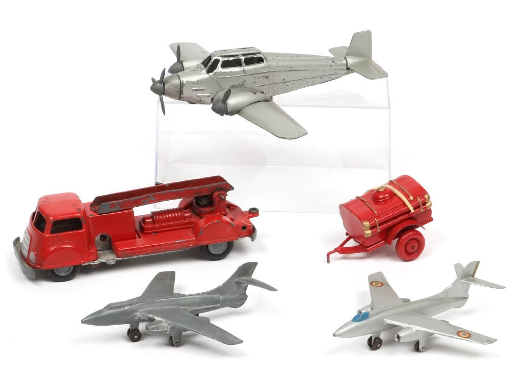 on y retrouve les marques : POLICHINELLE (camion de pompiers grande échelle - série démontable - avec manques, parties cassées, métal fatigue & oxydation), remorque (non conforme au camion), DINKY TOYS (référence 60B dont un décapé) & SOLIDO (démontable - 2 pales d'hélice cassées & manquantes - quelques traces d'oxydation)