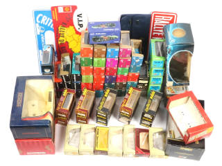 on y retrouve les marques : BRUMM, RIO, ELIGOR, SOLIDO, MATCHBOX, BBURAGO, MAISTO, POLISTIL & ALTLAS - quelques boîtes incomplètes - on y joint 3 plaques de rallyes (2 en PVC & une en tôle) & une sacoche