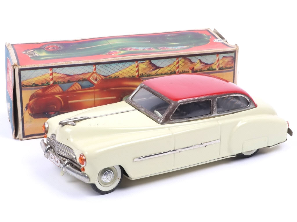 longueur 25 cm - avec moteur à pile (à revoir) & direction - traces d'oxydation plus ou moins importantes par endroits - optiques de phares cassés & incomplets